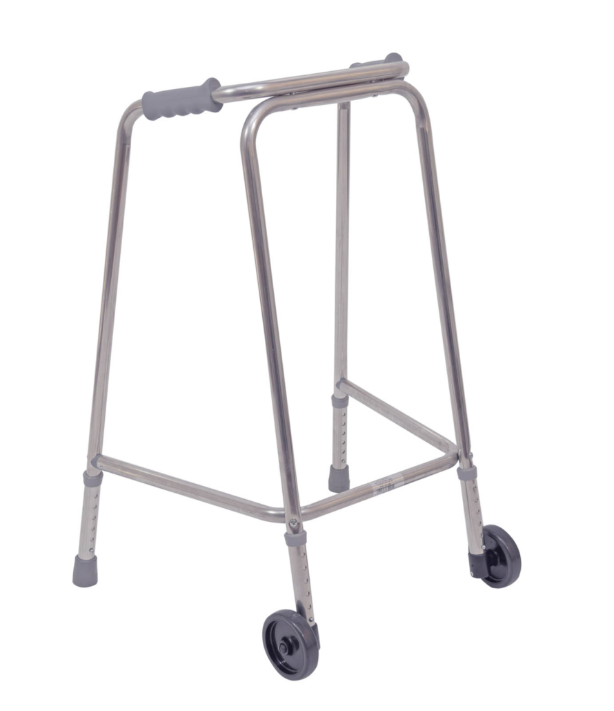 A Lightweight Aluminium Walking Frame with a wide base for maximum stability, ideal for home use. The lightweight aluminium walking frame features soft grip handles and height adjustable legs. It can be supplied with or without wheels.